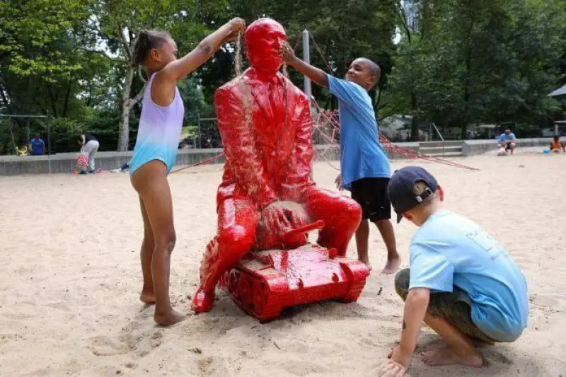 Фигура установлена в детской песочнице, и малыши разными способами испытывают ее на прочность. В частности, пытаются оторвать ствол пушки игрушечного танка между ног пластмассового российского диктатора.