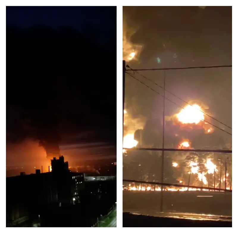 Видео о пожаре в Брянске публикуют в социальных сетях. На кадрах видно, что пламя очень крупное, и зарево от огня видно из разных точек города, а также слышны звуки воздушной тревоги.