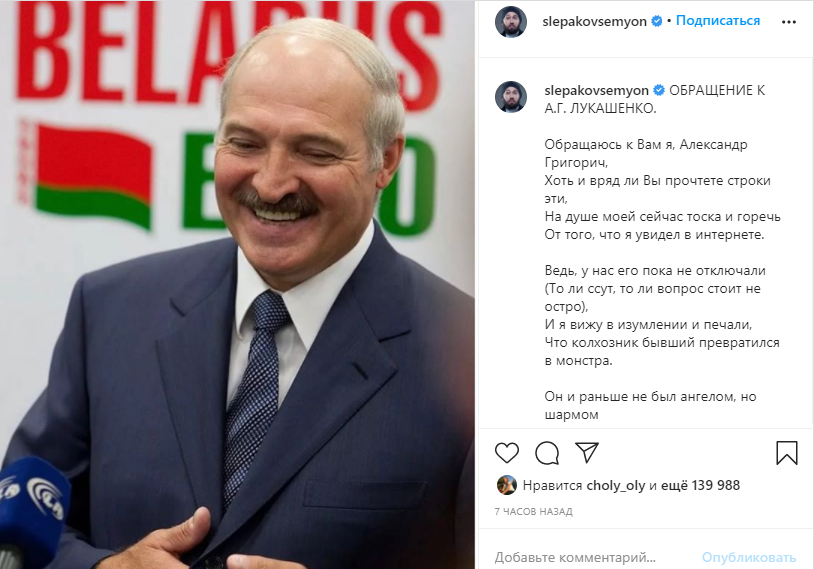 Известный российский юморист Семен Слепаков с помощью рифмы обратился к президенту Беларуси Александру Лукашенко и высказал свое негативное отношение к протестам, которые охватили страну.